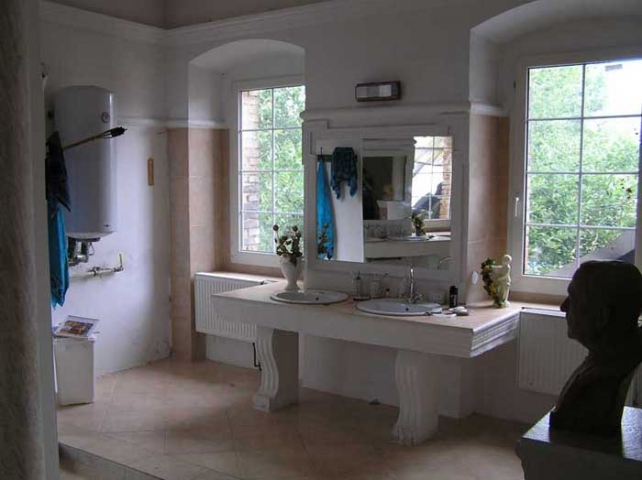 Sociální zařízení: Hlavní 26 m2 velká koupelna v římsko - antickém stylu, rohová vana má - 12 perličkových a 6 masážních trysek, s masivním stolovým dvojumyvadlem, s WC, sprchovým koutem, 3 schodišťové stupně a dva centrální sloupy, obklady a dlažby značky Topline italské keramičky, přes 3,5 m2 zrcadel, pračka. Vchod je z 50 m2 pokoje /přísluší k ní/. Další WC se sprchovým koutem a umyvadlem přísluší ke třem pokojům. Třetí WC se sprchovým koutem a umyvadlem je v severním pokoji. Další WC, umyvadlo v přízemí.