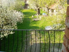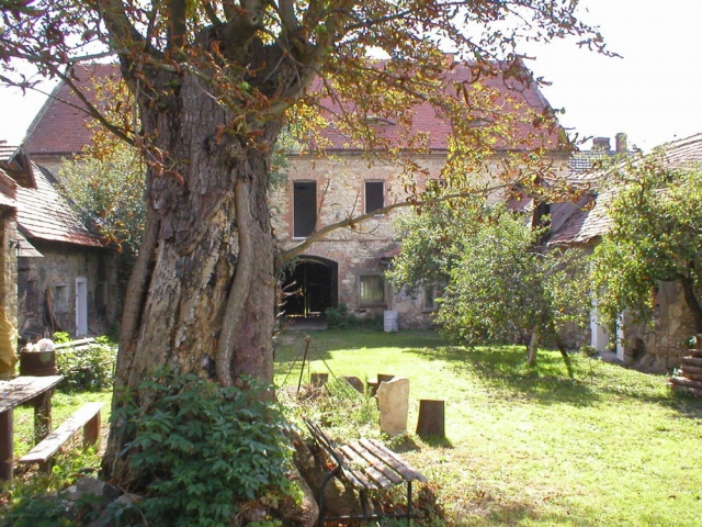 Velký sad je za stodolou. Ze dvora lze vrátky ve zdi projít na uzavřenou malebnou zahrádku cca 14x10 m s dominantním čedičovým krbem s ohništěm pro rožnění/grilování /80x110 cm/.