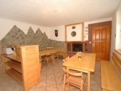 - spoločenská miestnosť krbom, jedálenskými stolmi, barovým pultom a vybavenou kuchynskou linkou (plynový sporák s elektrickou rúrou, chladnička, mikrovlnka, rýchlovarná kanvica)