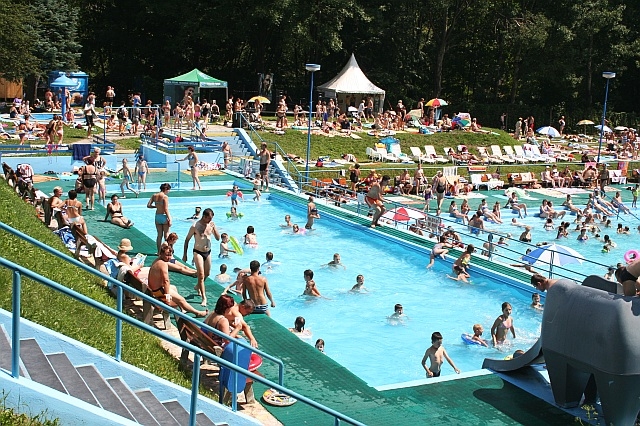 Autokemp s chatkami je součástí areálu termálního koupaliště.