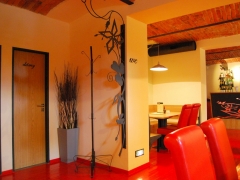 Vlastní restaurace (otevřena denně s nabídkou poledního menu, možnost snídaně, polopenze, plné penze; letní terasa s kapacitou 90 míst), volně přístupná kuchyně pro hotelové hosty v prvním patře, apartmány s kompletně vybavenou kuchyní.