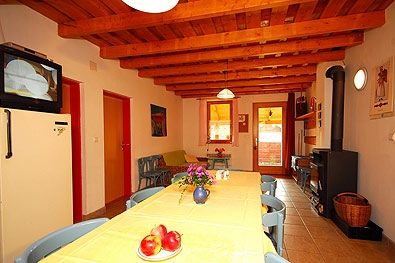 Dom ma veľkú spoločenskú miestnosť s krbom a TV /35m2/, ktorého súčasťou je kuchyňa.