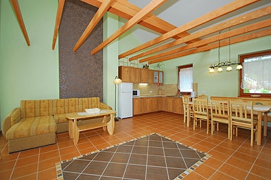 Apartmán má veľkú spoločenskú miestnosť s krbom a jeho súčasťou je plne vybavená kuchyňa.