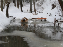 Možností je také domek u ohniště se třemi jednolůžky, jedním dvoulůžkem a dvěma vyvýšenými lůžky, kde je možné využít venkovní sprchu s teplou vodou a venkovní kuchyň.