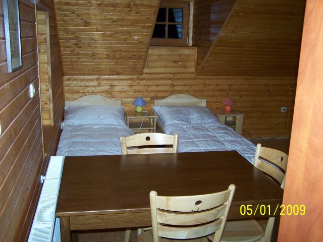 Srub - v přízemí je společenská místnost s krbem, plně vybavená kuchyň a jeden třílůžkový pokoj. V prvním patře jsou 2 čtyřlůžkové pokoje. Každý pokoj má vlastní koupelnou a WC. Ve společenské místnosti je rozkládací pohovka pro 2 osoby. Celková kapacita chalupy je 13 osob.