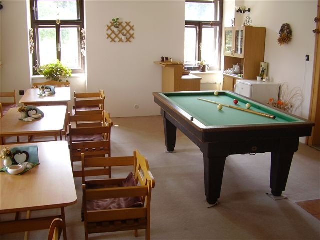 V přízemí je společenská místnost s krbem, kulečníkem a šipkami.