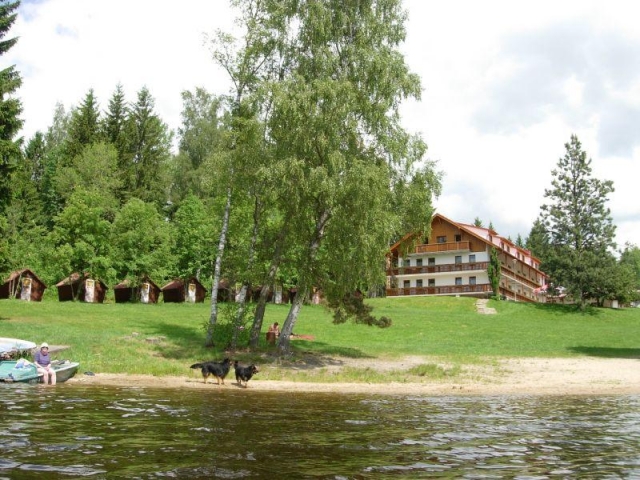 K dispozici restaurace s letní terasou s výhledem na jezero, salónek s krbem.