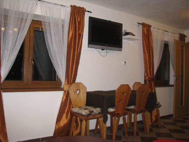 V létě je zde k dispozici pivní set pro deset osob. Za vchodem se nachází předsíň s lavicemi, věšákem a botníkem. Za dalšími dveřmi, které zabraňují úniku tepla, vcházíme do spodní části apartmánu. V této části je prostorná jídelna s velkým stolem a židlemi z masívu, kuchyň vybavená mikrovlnkou,myčkou,rychlovarnou konvicí, ledničkou, mrazničkou, nádobím , příbory a vším co je potřeba k vaření a společenská místnost s prostorným gaučem , televizí a rádiem. V prvním patře se nachází koupelna se dvěma umyvadly,sprchovým koutem,záchodem a bidetem.