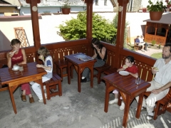 Jedáleň - je na prízemí s výhľadom do záhrady a na historické hradby mesta. Je útulná a v lete je na nej možnosť raňajkovania aj na terase.