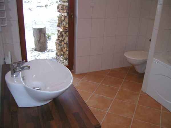 V přízemí vstupujeme do předsíně, kde jsou i prostory pro odložení lyží, snowboardů, či v létě kol a sušák na boty.. Z chodby je přístupná koupelna s umyvadlem, WC, SAUNOU, vanou, pračkou. V koupelně je pro Váš komfort podlahové vytápění. Přes chodbu se dostanete do obývacího pokoje s LCD TV, digitálním satelitem a přípojkou na INTERNET ZDARMA, pokud si přivezete Váš počítač. Rozkládací sedačka, umožňuje komfortní úpravu na dvoulůžko. Topení je elektrické plně automatické, nebo si můžete večery zpříjemnit neopakovatelnou atmosférou, kterou poskytují krbová kamna a v nich plápolající, praskající oheň a příjemně se linoucí teplo...no a se sklenkou vína… V části obývacího pokoje je i kuchyň, kompletně vybavená pro 8 lidí. Je zde sporák s troubou, lednička s mrazákem, mikrovlná trouba, kávovar, opékač topinek, nerezové hrnce a příbory, myčka….