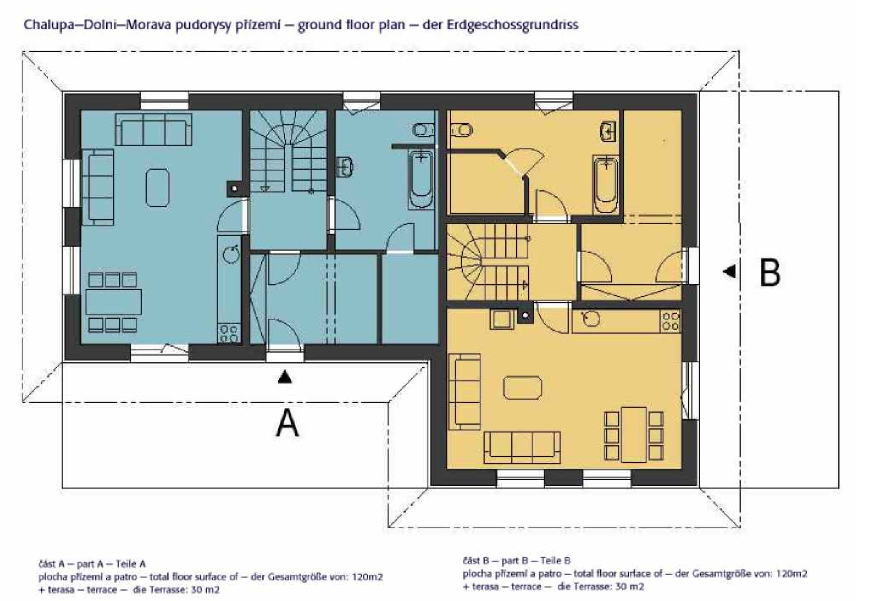 V každé části je vlastně patrový byt 4 + kk + 2 WC + koupelna + SAUNA o podlahové ploše 120m2 s 6 řádnými lůžky ve 3 ložnicích + 2 lůžka na rozkládací pohovce v obýváku !!