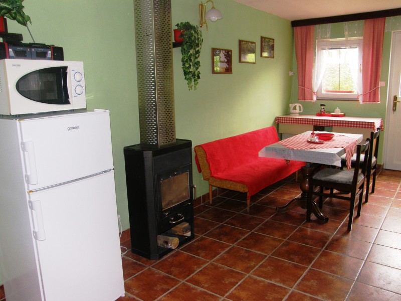 na stolní tenis. Z chodbičky je kromě standardního soc. zařízení přístupný obývací pokoj (obývací stěna, pohovka, stolík, 2 křesla, TV, satelit) a kuchyň s jídelnou.
