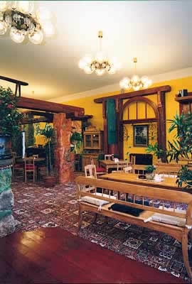 Restaurace s barem, kavárna a salónek a letní terasa.