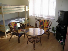 3x dvojlůžkový a 2 x 6ti lůžkový pokoj, sprcha, sociální zařízení, kuchyňka, vařič, varná konvice, lednice, mikrovlnná trouba, připojení na internet. Bezbariérový přístup.