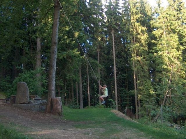 Dětské hřiště s houpačkami, trampolínou a pískovištěm. V zimě pro děti stavíme velký tobogán končíci na zahradě.