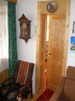 miestnosť s krbom a spálňa pre 2 osoby. Na poschodí je veľká spálňa s 5