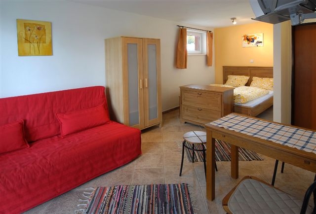posteľ + 2 x možný prístelok, TV. Kuchynský kútik, chladnička,