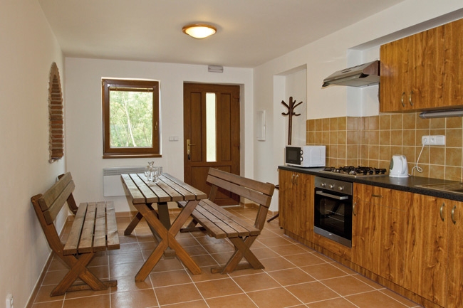 Vstup do penzionu je z venkovní terasy do společenské místnosti, ve které je vybavená kuchyně/kuchyňská linka, plynový sporák, mikrovlnka, lednice, varná konvice a nádobí/.